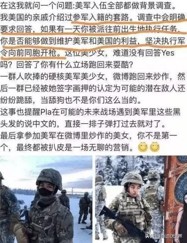 你知道双国籍是违法的吗?你以为是好事儿呢?所以呢,说到这儿大家都明白了吧!这深圳女孩儿高天才不仅是自己为了获得美国国籍,成为了美国陆军空降兵,她可能还负责着一些为美军做宣传,甚至是在国内征兵的工作。而她针对国内社交平台的宣传圈粉究竟是谁捧出来的,这种人的存在,又是在恶心谁、针对谁、背后有什么样的居心叵测的目的,这回大家应该心里有自己的判断,有点数了吧!