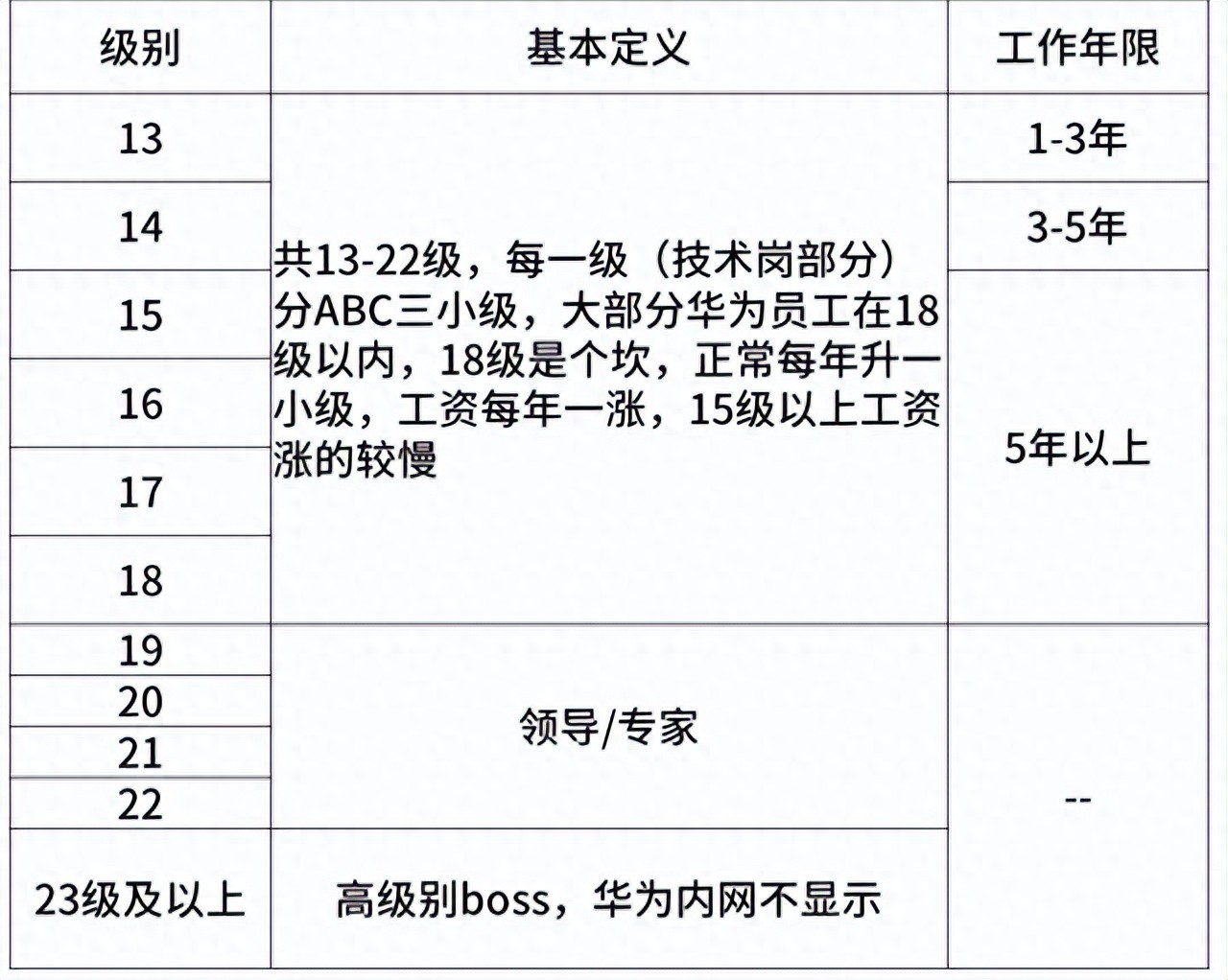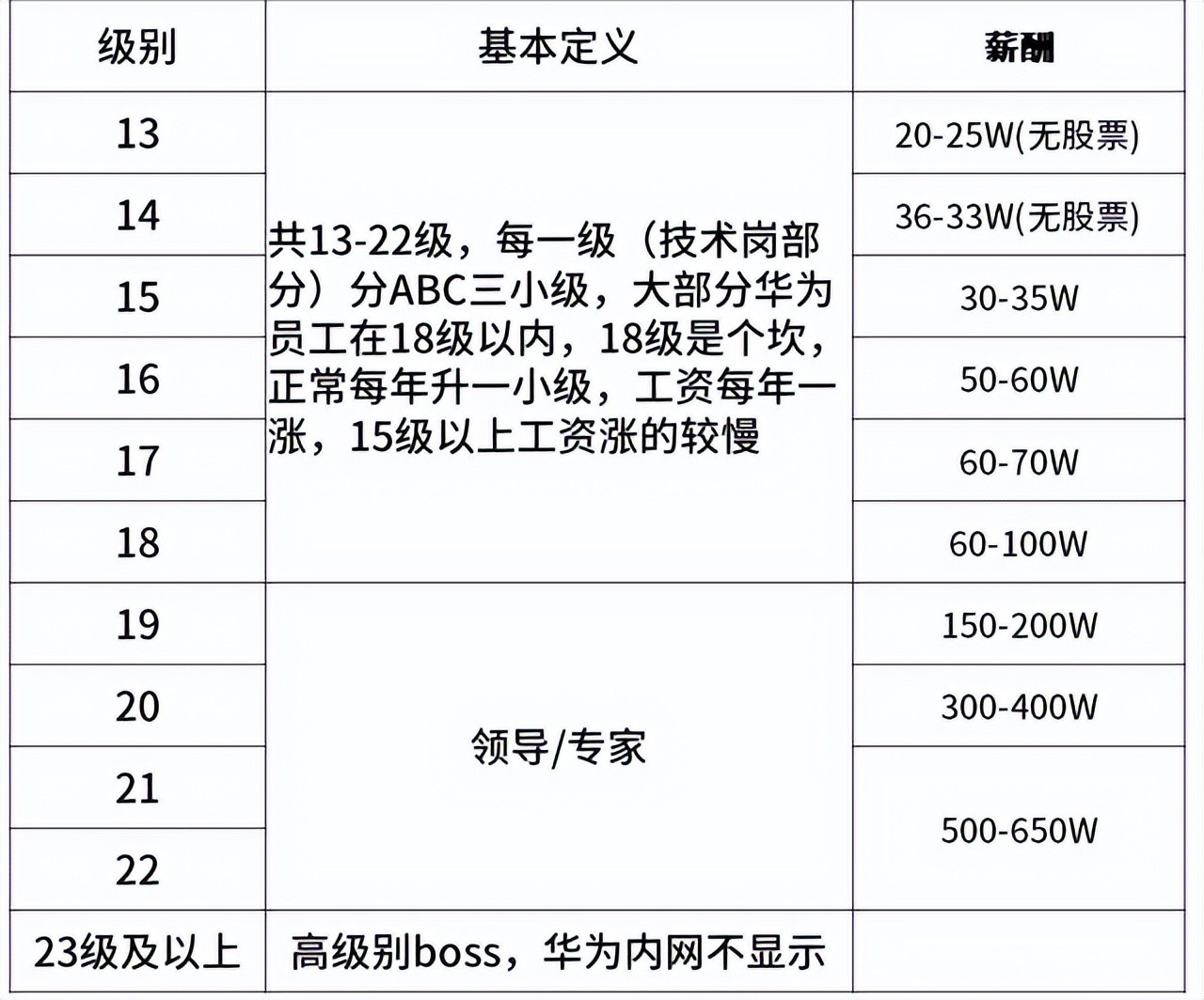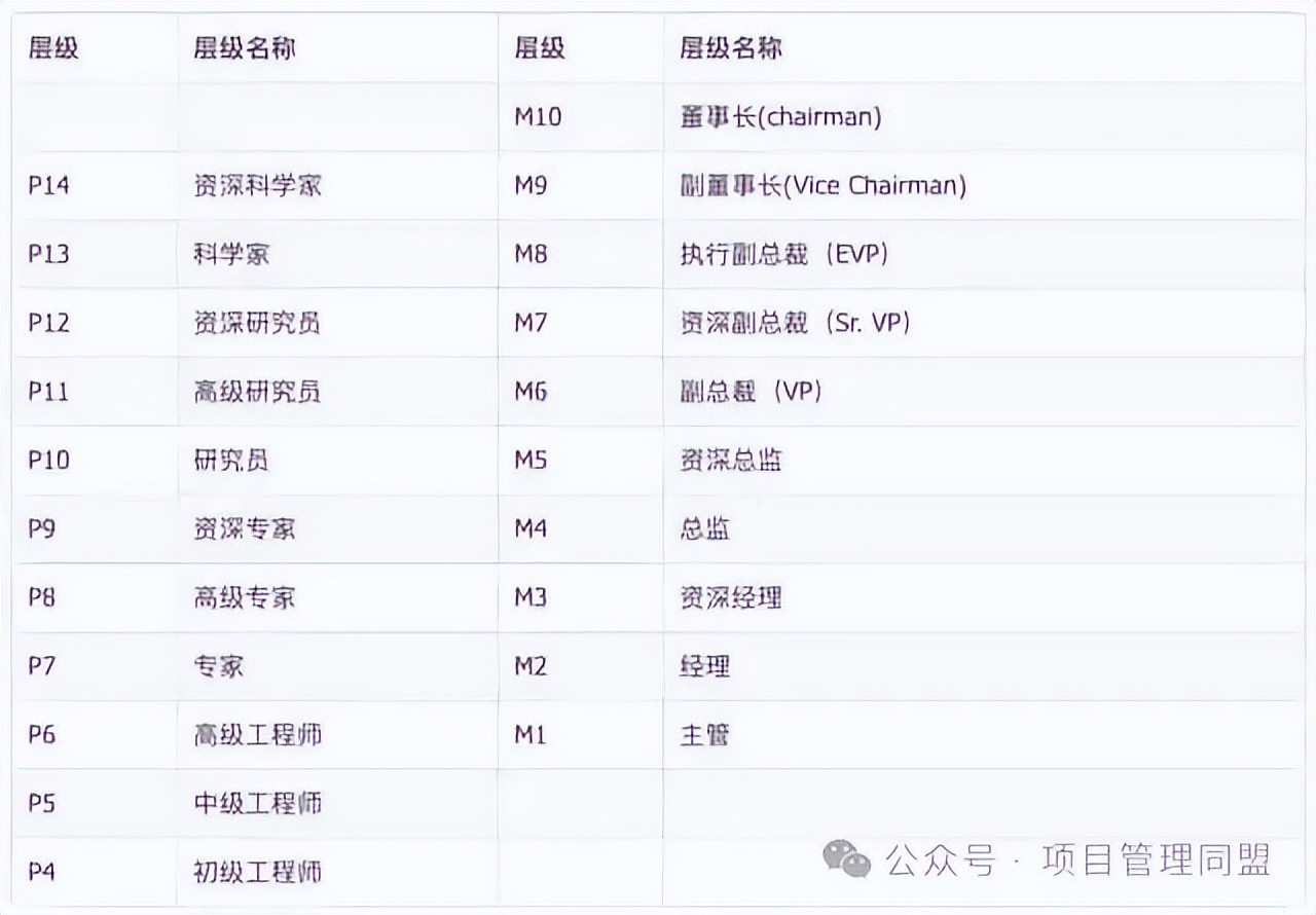 18级是重要分水岭,往上升需要重新考评、答辩,越过去后就是领导/专家级项目经理。正常来讲,每年可以升一小级,工资每年一涨,不过15级以上工资涨得较慢。当然,业绩特别突出的项目经理,也可以一年涨一大级甚至连跳二三级。19级以上属于领导岗和专家级项目经理,公司内网可查到22级以内,23级以上的则属于非常高级别的boss。
