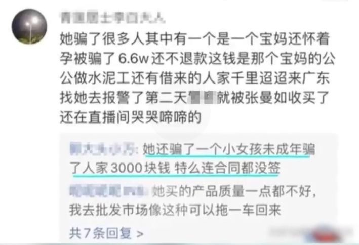 2020年。一位宝妈在抖音上直播打假张曼如。宝妈表示。自己本来想帮家里减轻一些负担。所以就交了6.6万成为了公司的合伙人。然而张曼如在收钱之后,态度就来了个180度的大转弯。对宝妈也没了之前的积极。更是对宝妈的询问敷衍了事。之后这位宝妈就觉得张曼如不靠谱,提出了退款的请求。但这个钱最终也是肉包子打狗有去无回。