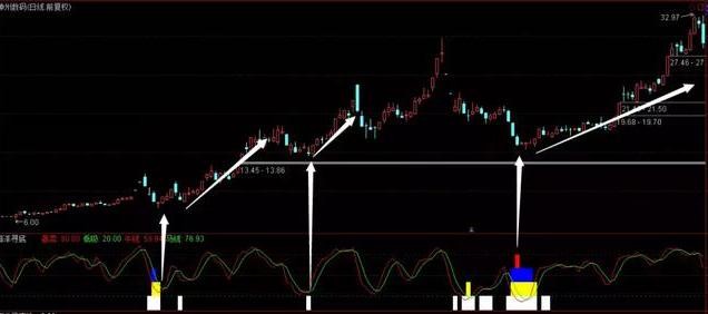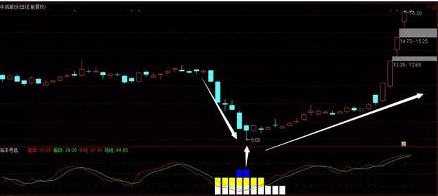 2、大底,选取对象为海洋寻底指标出现蓝色柱体的个股【白、黄、蓝三色叠加】