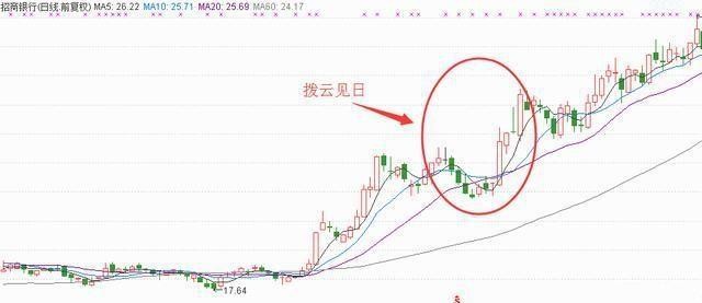 “拨云见日”是一种上涨途中的调整K线组合形态。股价由部开始向上拉升,在上攻途中突然遇到大量卖盘的打压,上攻受阻,随后股价展开了连续几日的阴线调整,股价似乎无力上攻,成交量也伴随股价回调缩量;随着卖盘的越来越少,另一部分看好该股的投资者开始买入股票。