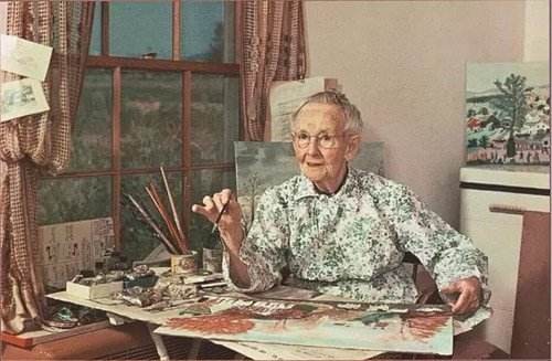 摩西奶奶的绘画经历开始于77岁那年,为了追求自己的绘画梦,她买回来画笔、画纸和颜料,坐在家里开始学画。