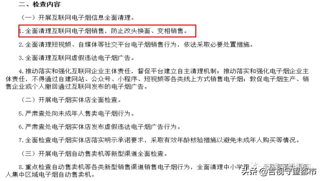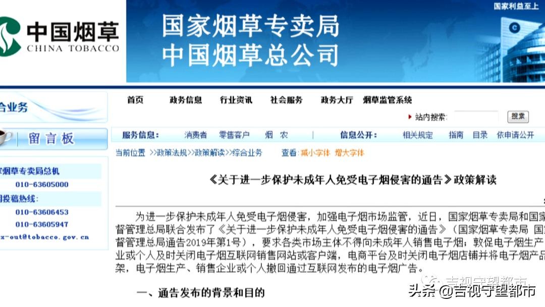 在去年8月发布的《关于禁止向未成年人出售电子烟的通告》基础上,国家烟草专卖局和国家市场监督管理总局决定,再次联合发布通告:不得通过互联网发布电子烟广告,并敦促电商平台下架电子烟产品。