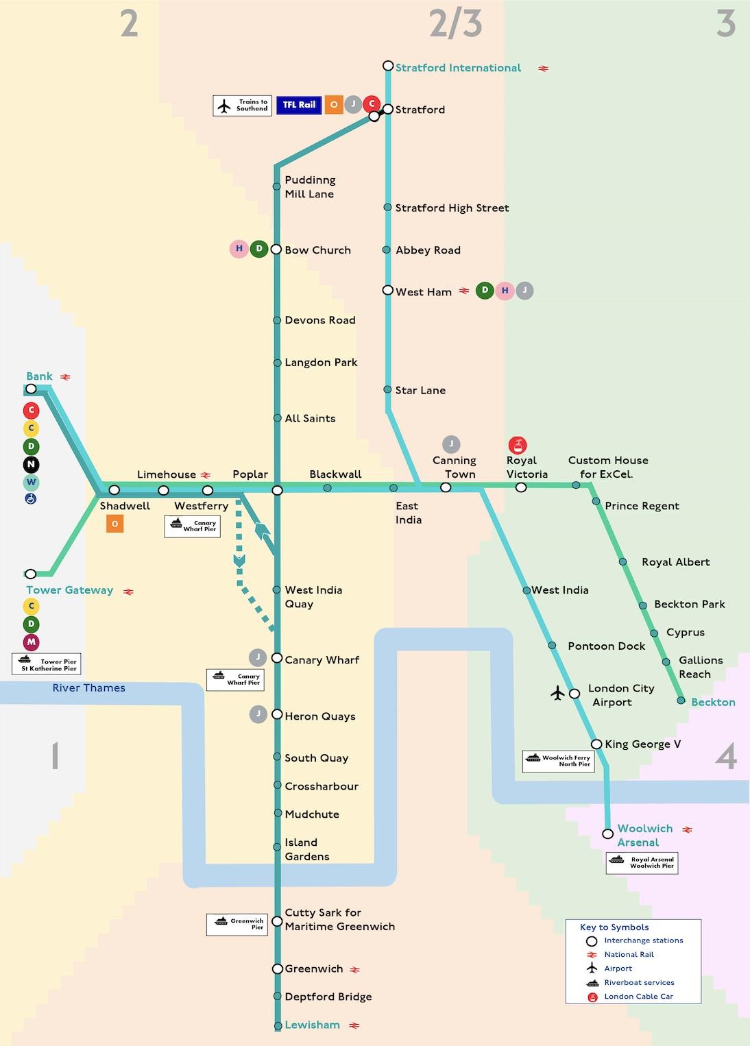 DLR轻铁连接伦敦的东一区及东四区,途径伦敦新老两大金融城,Bank及Canary Wharf。另外,此线路覆盖的区域东起Beckton及Woolwich Arsenal,南起Lewisham、西起伦敦金融城Bank及Tower Gateway,以及北起Stratford及Stratford International。四通八达的交通线路为伦敦码头区的住民带来了便利。