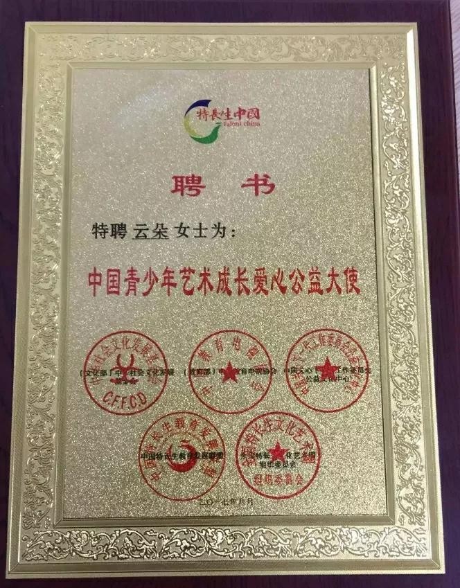 2017年,云朵获得了“中国青少年艺术成长爱心公益大使”的称号。