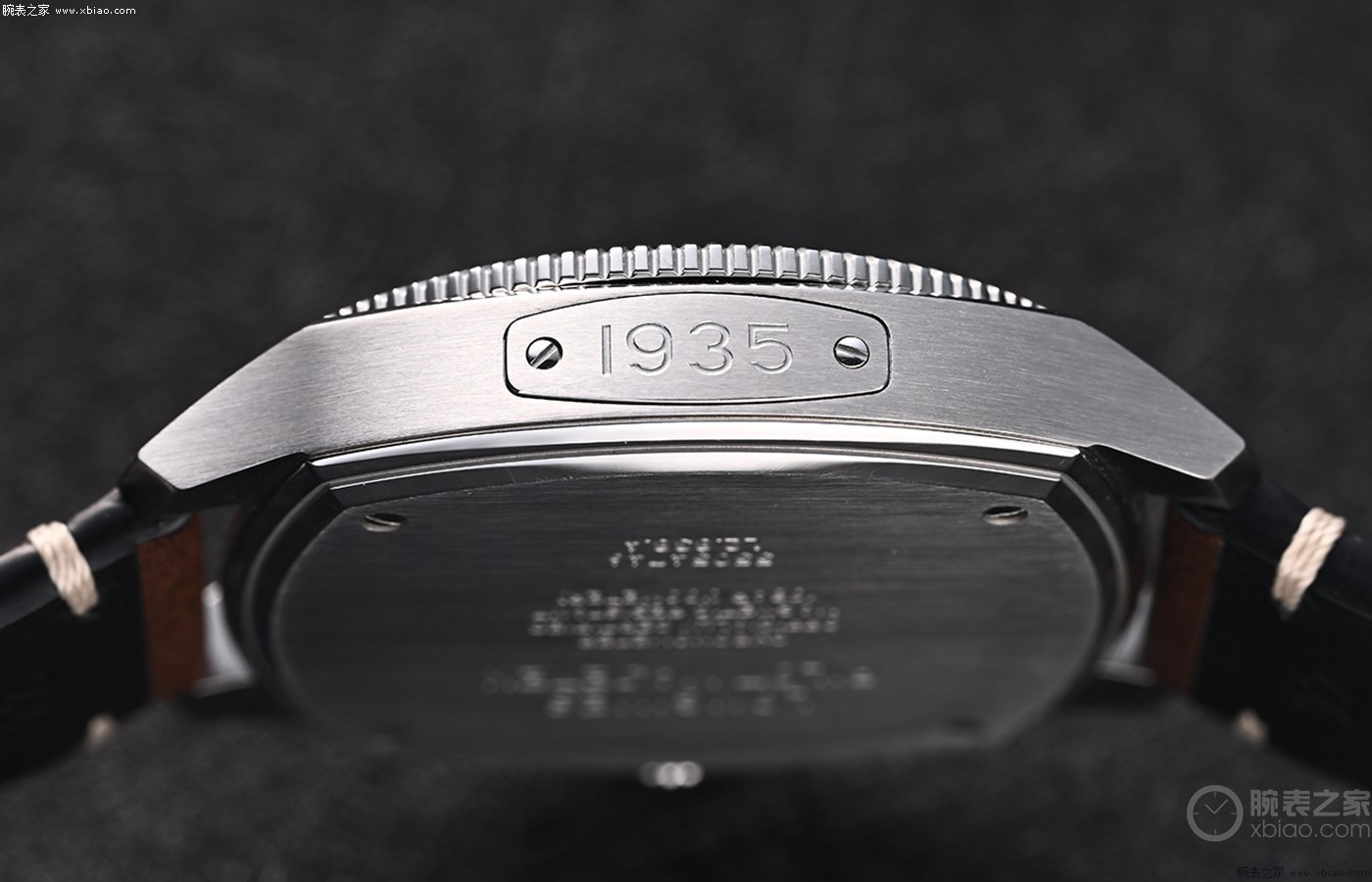 在这款表上,我们能够看到与古董表相一致的弧面枕形表壳,该设计在1935年4月1日就获得了注册专利,不仅能够有效提高表款辨识度,也使腕表佩戴起来更加舒适。此外,精钢表壳的外侧9点钟位置还刻有“1935”字样,象征着捷克空军1935腕表的诞生年份,细节之处颇为用心。