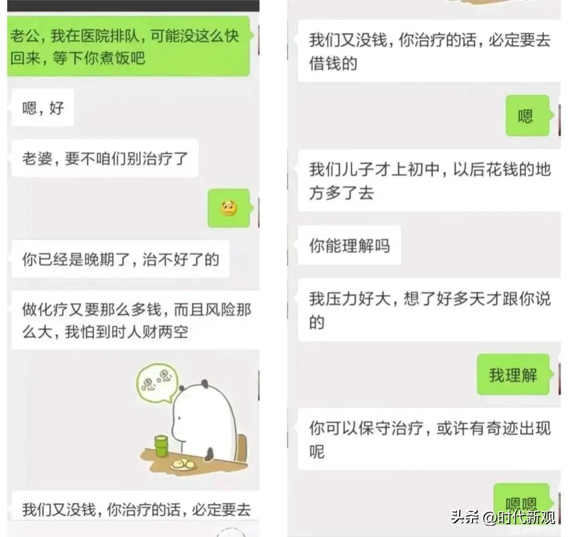 事情的起因是一对夫妻双双患有癌症晚期,妻子一个人来医院排队等待治疗,结果同是癌症晚期的丈夫发来消息,让妻子不要再治疗了,治疗的话不光要花光积蓄,而且还得借钱,这样他们走后就给孩子留不下钱了。