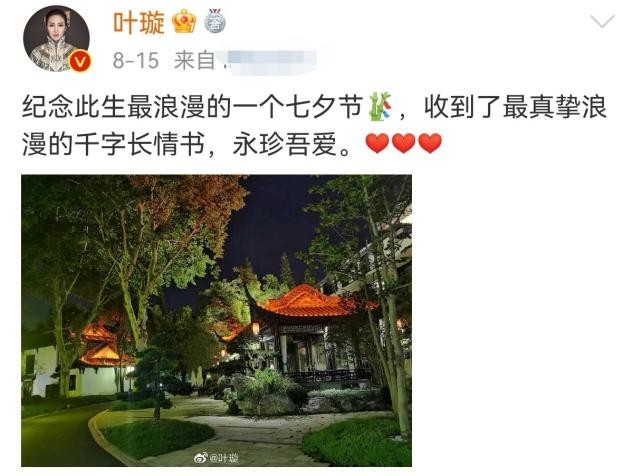 叶璇在在七夕那天还晒出了自己的美照并发文称“纪念此生最浪漫的一个七夕节,收到了最真挚浪漫的千字长情书,永珍吾爱”,写千字情书长情书这个举动也被网友猜测肯定是有男友了吧。