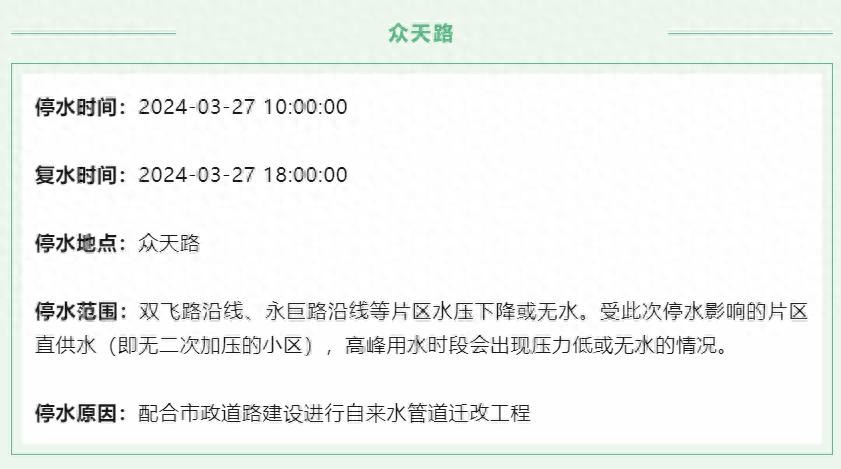 停水时间:2024-03-27 10:00:00