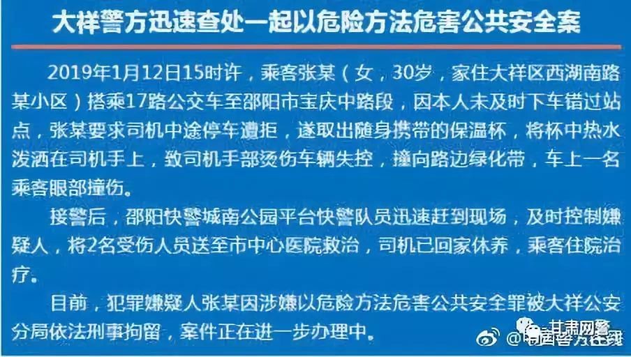 12日,湖南邵阳女子张某搭乘公交车未及时下车错过站点,要求司机停车遭拒,遂取出随身携带保温杯,将热水泼洒在司机手上,致司机手部烫伤车辆失控撞向路边绿化带,车上一名乘客眼部撞伤。现已被刑拘。(大祥公安)