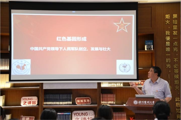 “红军不怕远征难,万水千山只等闲。”在全体同学朗诵的《七律·长征》中,王善顺开始了他的分享。经历了39年的军队生活,王善顺有着独属于军人的气场和气质,站姿挺拔、声音洪亮地为同学们讲述”红色基因“的发展史,仔细地讲解起每种红色精神背后的内涵。