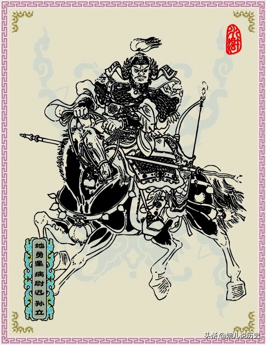 孙立绰号“病尉迟”, 使得一支长枪及一竹节钢鞭,早先劫了大狱救出了解珍、解宝兄弟,这才投奔梁山,上梁山后负责在战斗中巡视、探听消息,跟随宋江南征北战,征辽时,孙立大战寇镇远,将其击杀,征讨田虎时,孙立大战方琼,征讨方腊时,大战甄诚三十合,不分胜败,活捉了雷炯,十分勇猛,就仿佛唐朝大将尉迟恭。