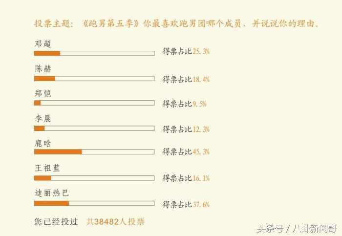 跑男团每个成员都有一批自己忠实的粉丝。根据某知名娱乐媒体网站对第五季7位固定嘉宾明星做了个人气调查报告。数据显示鹿晗以绝对的优势排名第一,票少垫底的没想到是“小猎豹”郑恺?