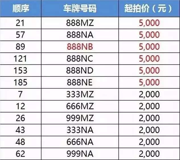 顺序车牌号码起拍价(元)1188MZ2,0002199MZ2,0003233MZ2,0004266MZ2,0005288MZ2,0006299MZ2,0007333MZ2,0008366MZ2,0009388MZ2,00010399MZ2,00011633MZ2,00012666MZ2,00013688MZ2,00014699MZ2,00015733MZ2,00016766MZ2,00017788MZ2,00018799MZ2,00019833MZ2,00020866MZ2,00021888MZ5,00022899MZ2,00023933MZ2,00024966MZ2,00025988MZ2,00026999MZ2,00027033MZ2,00028066MZ2,00029088MZ2,00030099MZ2,00031033NA2,00032066NA2,00033088NA2,00034099NA2,00035133NA2,00036166NA2,00037188NA2,00038199NA2,00039233NA2,00040266NA2,00041288NA2,00042299NA2,00043333NA2,00044366NA2,00045388NA2,00046399NA2,00047633NA2,00048666NA2,00049688NA2,00050699NA2,00051733NA2,00052766NA2,00053788NA2,00054799NA2,00055833NA2,00056866NA2,00057888NA5,00058899NA2,00059933NA2,00060966NA2,00061988NA2,00062999NA2,00063033NB2,00064066NB2,00065088NB2,00066099NB2,00067133NB2,00068166NB2,00069188NB2,00070199NB2,00071233NB2,00072266NB2,00073288NB2,00074299NB2,00075333NB2,00076366NB2,00077388NB2,00078399NB2,00079633NB2,00080666NB2,00081688NB2,00082699NB2,00083733NB2,00084766NB2,00085788NB2,00086799NB2,00087833NB2,00088866NB2,00089888NB5,00090899NB2,00091933NB2,00092966NB2,00093988NB2,00094999NB2,00095033NC2,00096066NC2,00097088NC2,00098099NC2,00099133NC2,000100166NC2,000101188NC2,000102199NC2,000103233NC2,000104266NC2,000105288NC2,000106299NC2,000107333NC2,000108366NC2,000109388NC2,000110399NC2,000111633NC2,000112666NC2,000113688NC2,000114699NC2,000115733NC2,000116766NC2,000117788NC2,000118799NC2,000119833NC2,000120866NC2,000121888NC5,000122899NC2,000123933NC2,000124966NC2,000125988NC2,000126999NC2,000127033ND2,000128066ND2,000129088ND2,000130099ND2,000131133ND2,000132166ND2,000133188ND2,000134199ND2,000135233ND2,000136266ND2,000137288ND2,000138299ND2,000139333ND2,000140366ND2,000141388ND2,000142399ND2,000143633ND2,000144666ND2,000145688ND2,000146699ND2,000147733ND2,000148766ND2,000149788ND2,000150799ND2,000151833ND2,000152866ND2,000153888ND5,000154899ND2,000155933ND2,000156966ND2,000157988ND2,000158999ND2,000159033NE2,000160066NE2,000161088NE2,000162099NE2,000163133NE2,000164166NE2,000165188NE2,000166199NE2,000167233NE2,000168266NE2,000169288NE2,000170299NE2,000171333NE2,000172366NE2,000173388NE2,000174399NE2,000175633NE2,000176666NE2,000177688NE2,000178699NE2,000179733NE2,000180766NE2,000181788NE2,000182799NE2,000183833NE2,000184866NE2,000185888NE5,000186899NE2,000187933NE2,000188966NE2,000189988NE2,000190999NE2,000191033NF2,000192066NF2,000193088NF2,000194099NF2,000195133NF2,000196166NF2,000197188NF2,000198199NF2,000199233NF2,000200266NF2,000