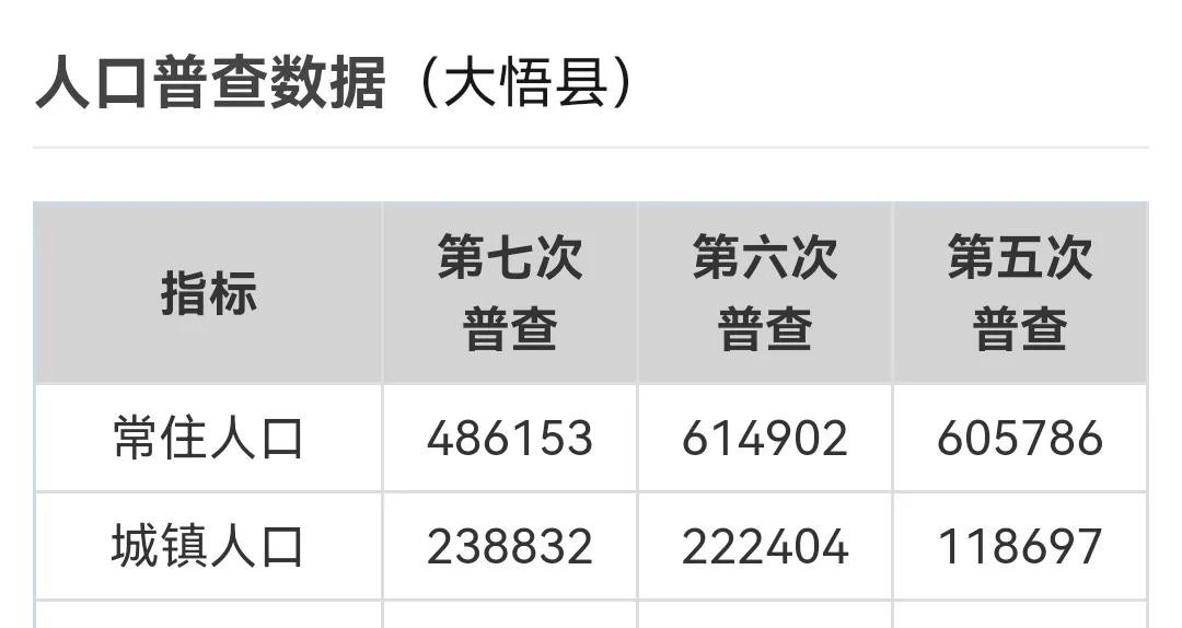 根据第七次人口普查数据,截至2020年11月1日零时,大悟县常住人口为486153人,其中男性252337人、女性233816人;城镇常住人口为238832人。