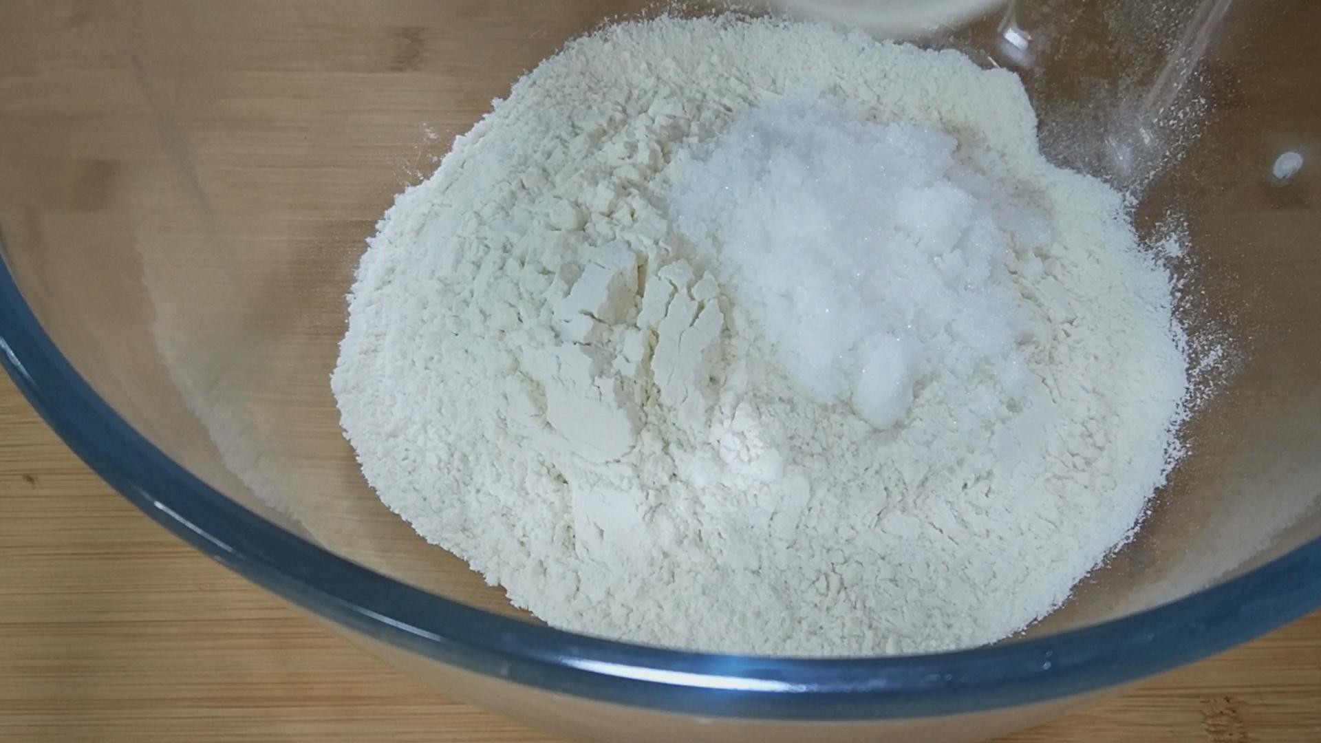 10、趁着烤板栗的时间,我们来制作水油皮,200克普通面粉中加入30克白糖
