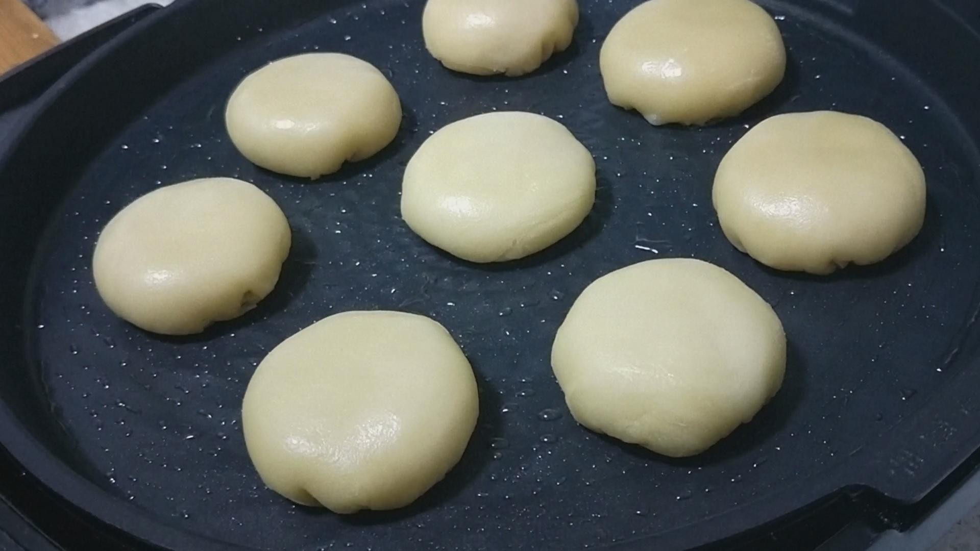 32、电饼铛开中火提前预热,刷一层薄油,把做好的板栗饼放到电饼铛中
