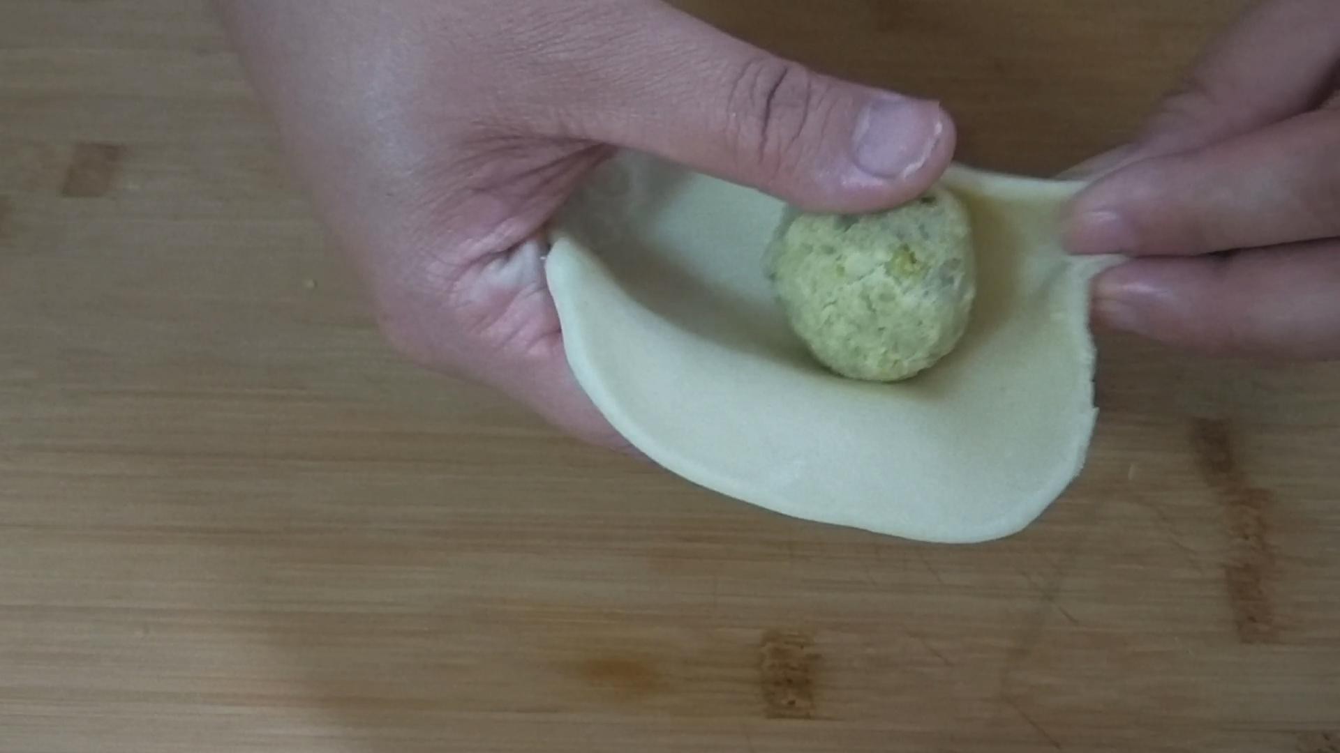 31、放上做好的板栗馅,像包包子一样包起来,稍微按扁一些,整理一下即可