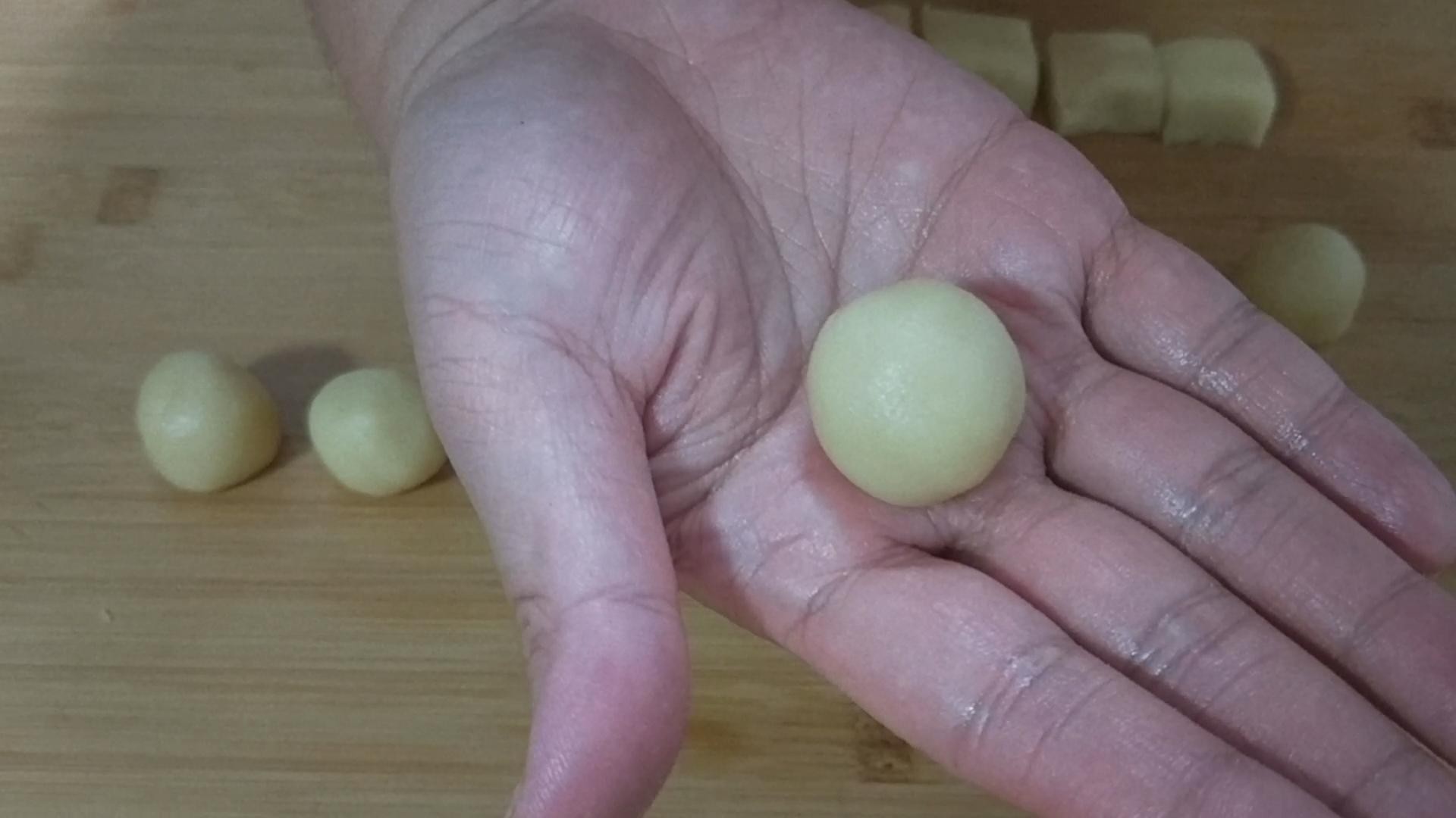 19、取出烤好的板栗,稍放凉后去皮即可,然后用擀面杖捣成板栗泥,可以加适量的白糖搅拌均匀,再用手因才圆球,分成16分即可