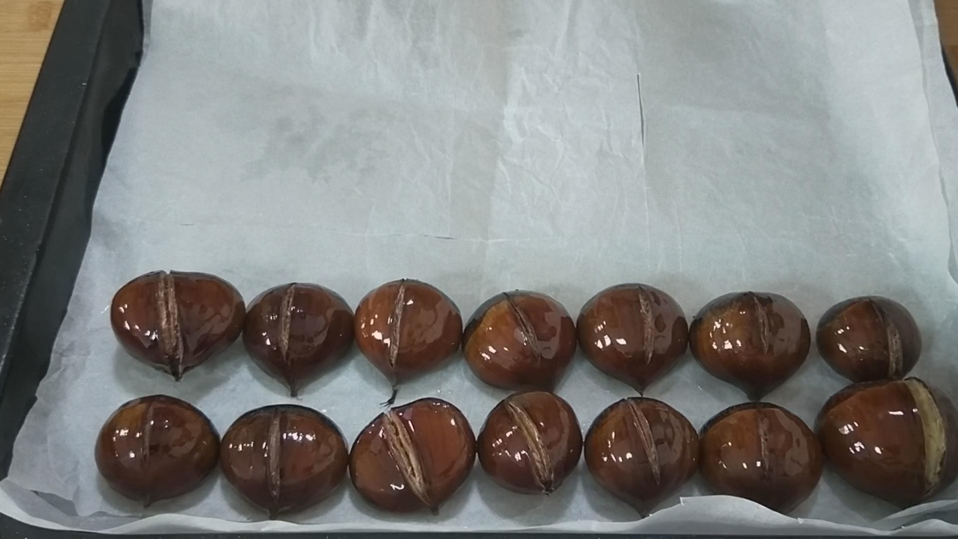 9、把板栗放入到烤箱中,180度烤25-30分钟,时间根据板栗的大小来调整