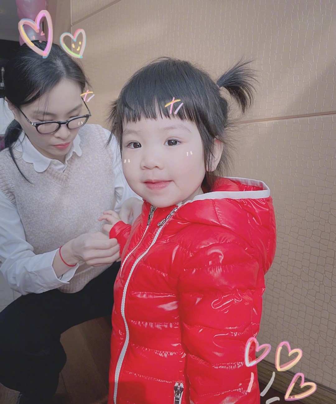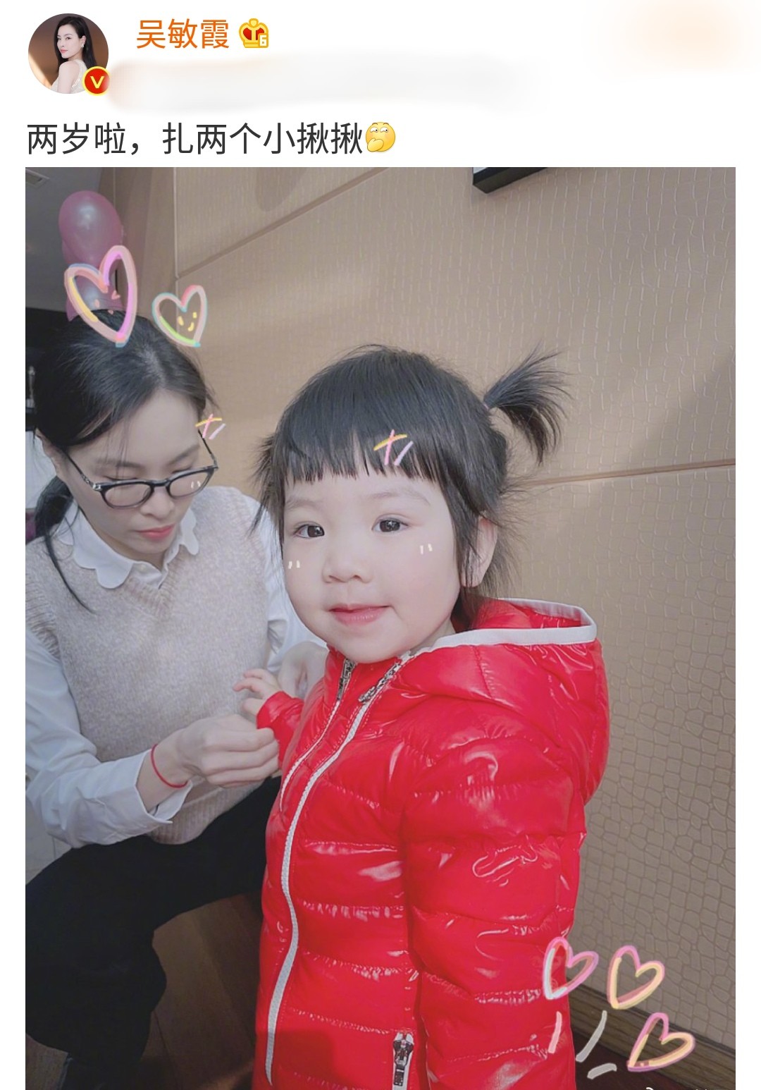 12月18日,跳水皇后吴敏霞在社交平台发文为女儿庆生,她晒出自己为女儿整理衣袖的照片,并配文"两岁啦,扎两个小揪揪"。