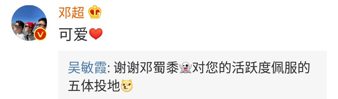 吴敏霞晒出照片后,未见其老公张效诚评论祝福,热评第一反而是邓超,邓超在评论区留言赞美西西"可爱",吴敏霞在表示感谢的同时,也调侃他"对您的活跃度佩服的五体投地",两个人的互动十分有趣。