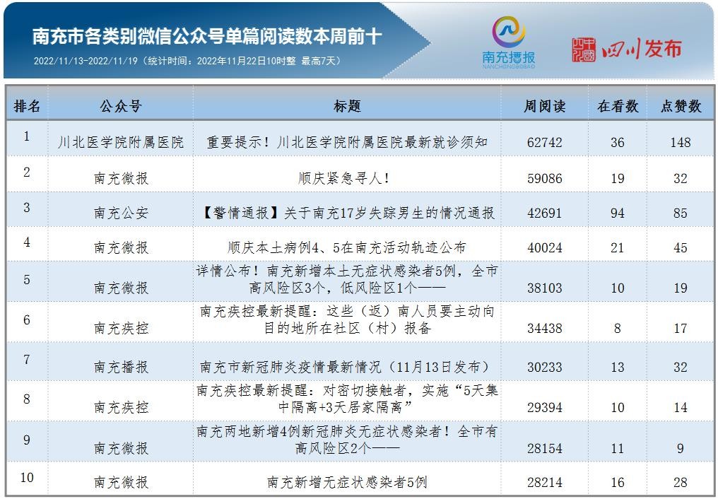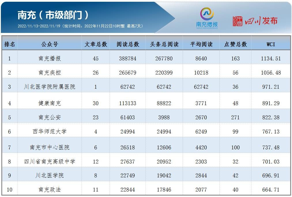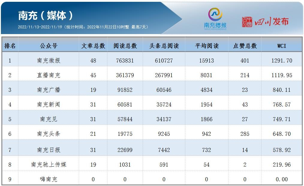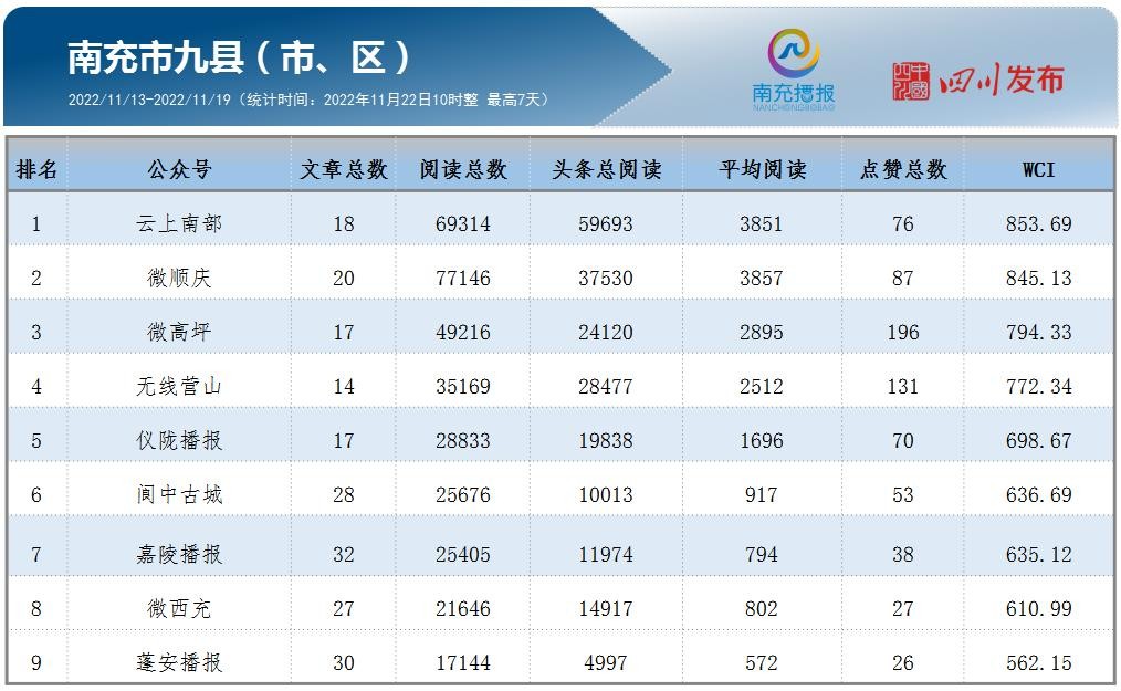 本榜单由清博大数据提供学术支持,四川发布提供榜单,由市委市政府官微“南充播报”每周三发布。监测时段:2022/11/13—2022/11/19采用周期内最近更新的数据计算(最高为7天)。