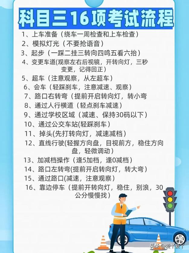 科目三考试16项包含:1.上车准备、2.夜间灯光模拟、3.起步、4.直线行驶、5.变道、6.通过路口、7.会车、8.超车、9.掉头、10.通过人行道、11.通过公交站、12.加减挡操作、13.路口左转弯、14.路口右转弯、15.通过学校、16.靠边停车。