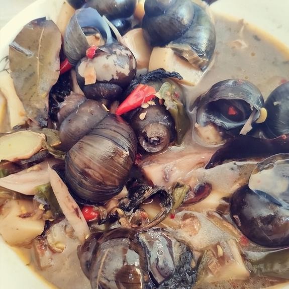 酸笋田螺煲,味道极佳。新鲜的田螺,清洗干净,钳去尖角部分,放进砂锅里,再加入酸笋、姜片、辣椒、蒜、盐、适量的清水,煲几十分钟,煲好的酸笋田螺,有一股臭臭的味道,但吃起来酸酸的、辣辣的,非常开胃,爱吃螺蛳粉的朋友,一定会爱上这道美食。