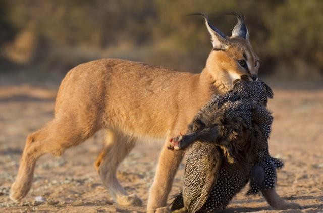 但对于鸟,狞猫似乎特别钟爱。尤其是珍珠鸡,它能容忍鸟身上的羽毛,常常捕到鸟后就囫囵吞枣,也不管羽毛有没有拔除干净。若是它发现鸟的尸体,它也能屈尊降贵吞食鸟的腐肉,吃下去后也不会拉肚子。