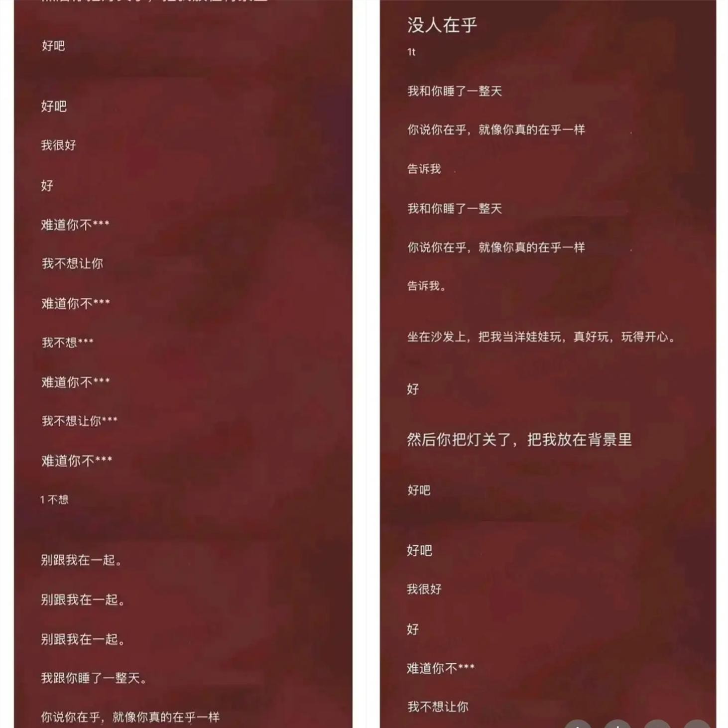 蔡徐坤在这张专辑里面,有一首英文歌叫《no body cares》,中文名叫没人在乎。根据歌迷在网上直接翻译的歌词可以看到,首先这个文字不断地在重复着几个词语,诸如别跟我在一起,难道你不想,我不想让你等等这样的口水话的字眼。