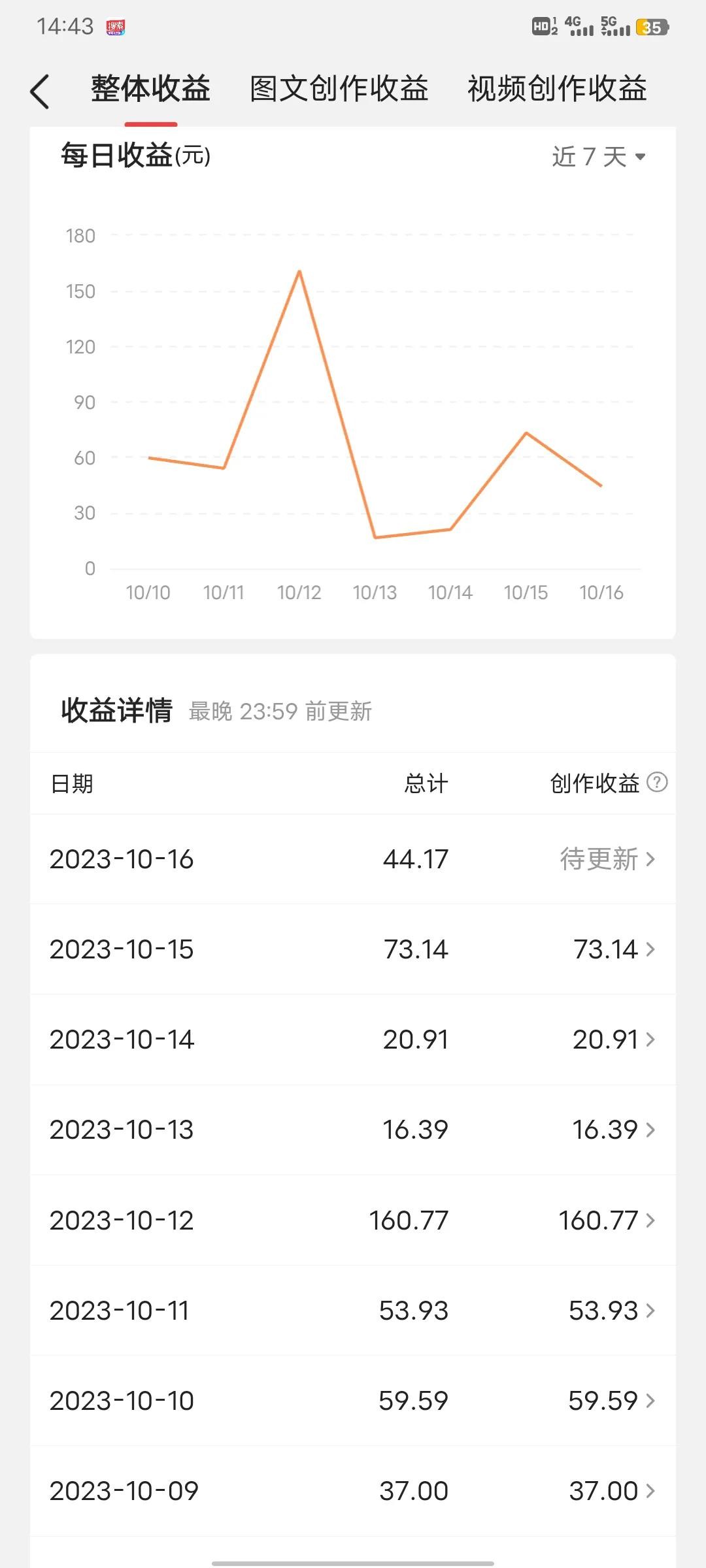 我最近文章写得很少了,基本上在吃老本,收益普遍低于一百元。如果我每天发十篇文章的话,那收益上一百不是问题。昨天,我的阅读量只有一万,收益44元,其实也算不错了,单价4.4元每千阅读,在头条也算是中等偏高了吧。