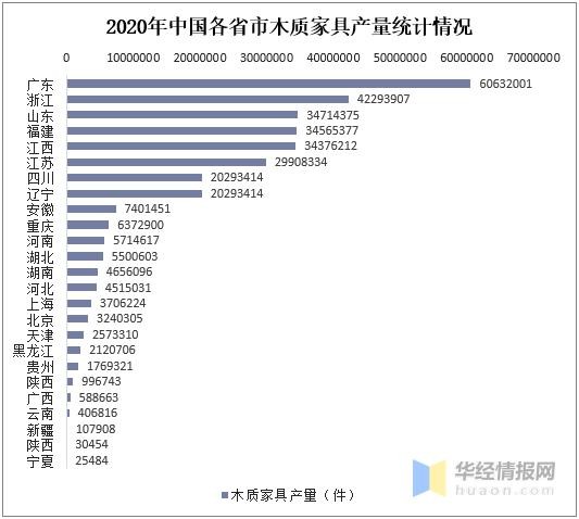 根据中国轻工业联合会数据显示,2020年中国木质家具产量为321572688件,其中广东省木质家具产量最高,达到60632001件;其次为浙江省,产量为42293907.山东、福建、江西三省木质家具产量相差不大,产量分别为34714375件、34565377件、34376212件。