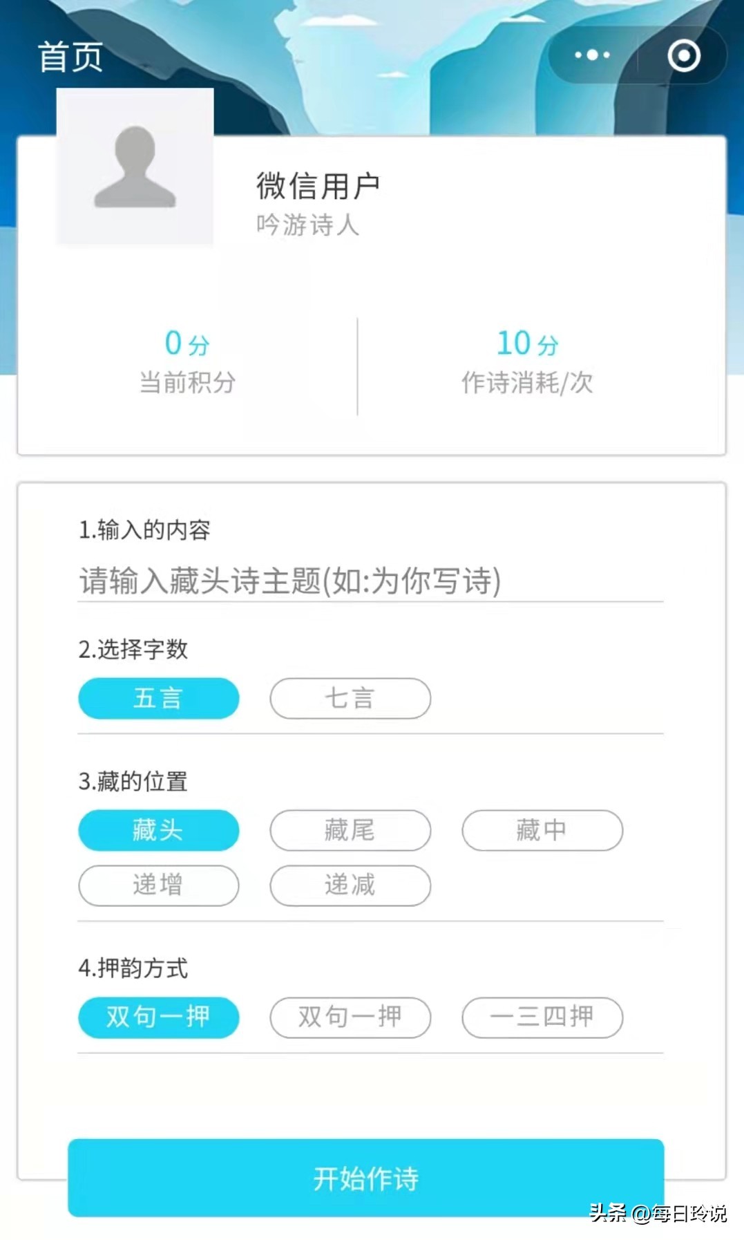 上图就是微信小程序-藏头诗生成器古诗词名字作情诗;能够看到不仅可以选择诗句的字数、藏字的位置,还可以选择押韵的方式!一下子就觉得自己好傻,居然相信了现在还有人能够一秒成诗!