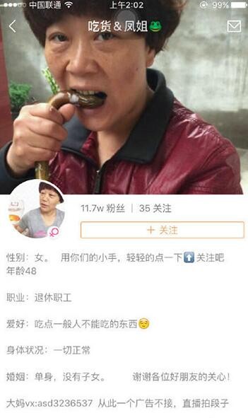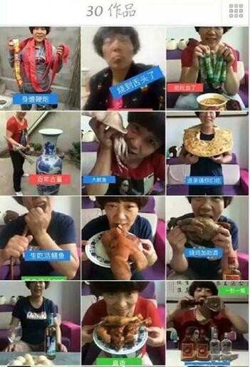 一位网名为“吃货凤姐”的大妈在视频软件上放出吃各种东西的视频,包括吃灯泡、生吃金鱼、生吃面包虫等。
