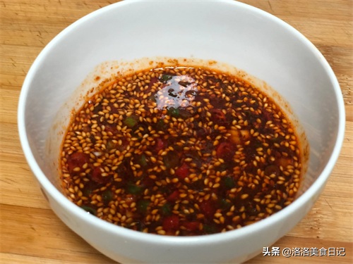 7、调凉拌汁。取1个小碗,碗中放入葱花、蒜末、小米辣、食盐、十三香、辣椒面、熟芝麻,将烧好的热油泼入碗中,搅拌均匀后再调入陈醋和生抽。