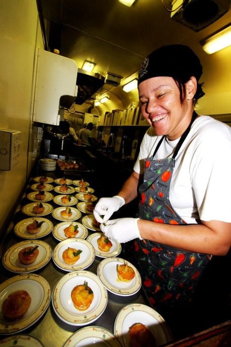 正准备甜品的厨师大姐看到镜头笑得很憨