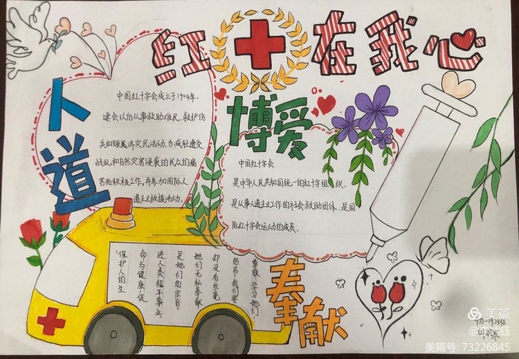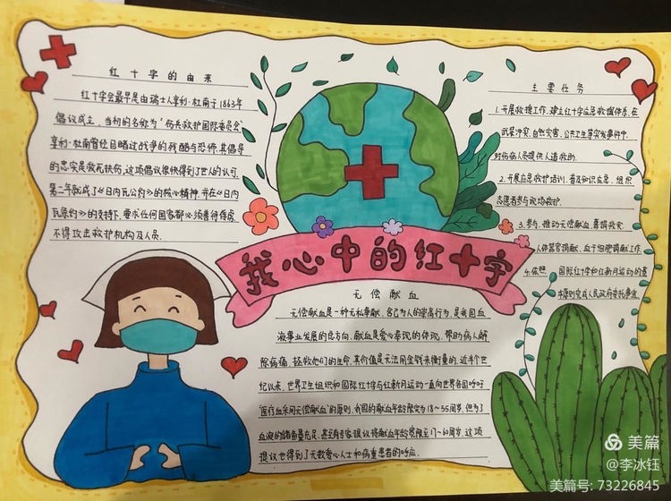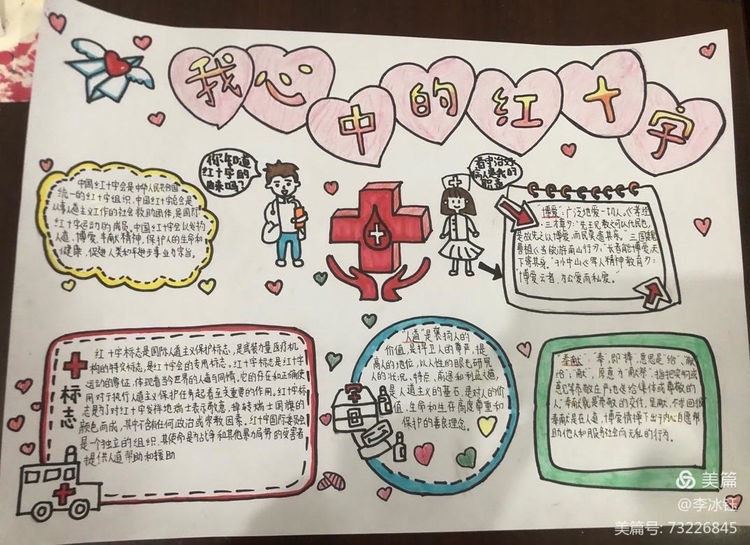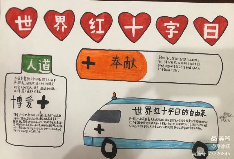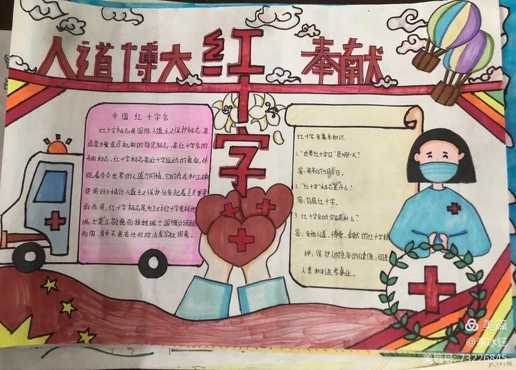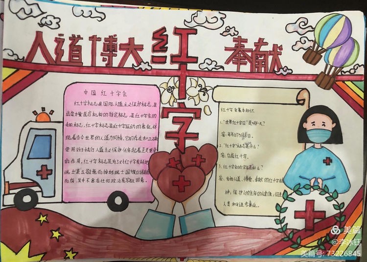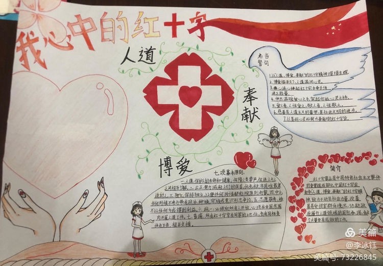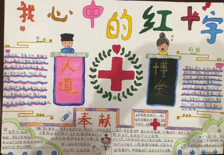 为广泛传播“人道、博爱、奉献”的红十字精神,发挥红十字工作在培养德智体美劳全面发展的社会主义建设者和接班人中的积极作用,引导广大青少年坚定不移听党话、感党恩、跟党走,涵养高尚情操,培养红十字会青少年关爱他人的思想品德和人道主义精神,广泛传播红十字文化,促进学校德育教育和校园文化建设。区红十字会在区二中举办了红十字青少年手抄报竞赛活动,同学们积极踊跃参与其中,涌现了大量的优秀作品。