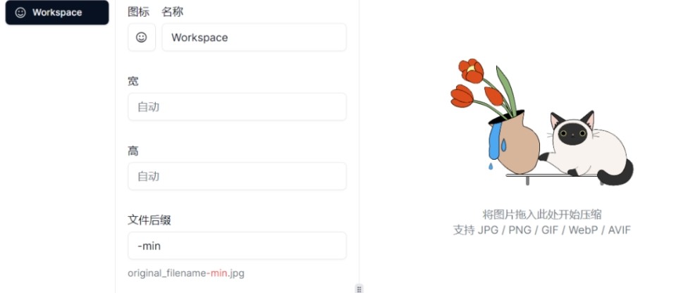 EIXOL的界面通常分为三部分:左侧用于新建不同的压缩类型以应对各种使用场景,中间用于调整具体参数(如图像的宽度、高度、输出格式、文件后缀、压缩强度等),右侧则用于拖放需要压缩的图片。