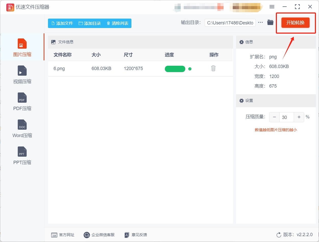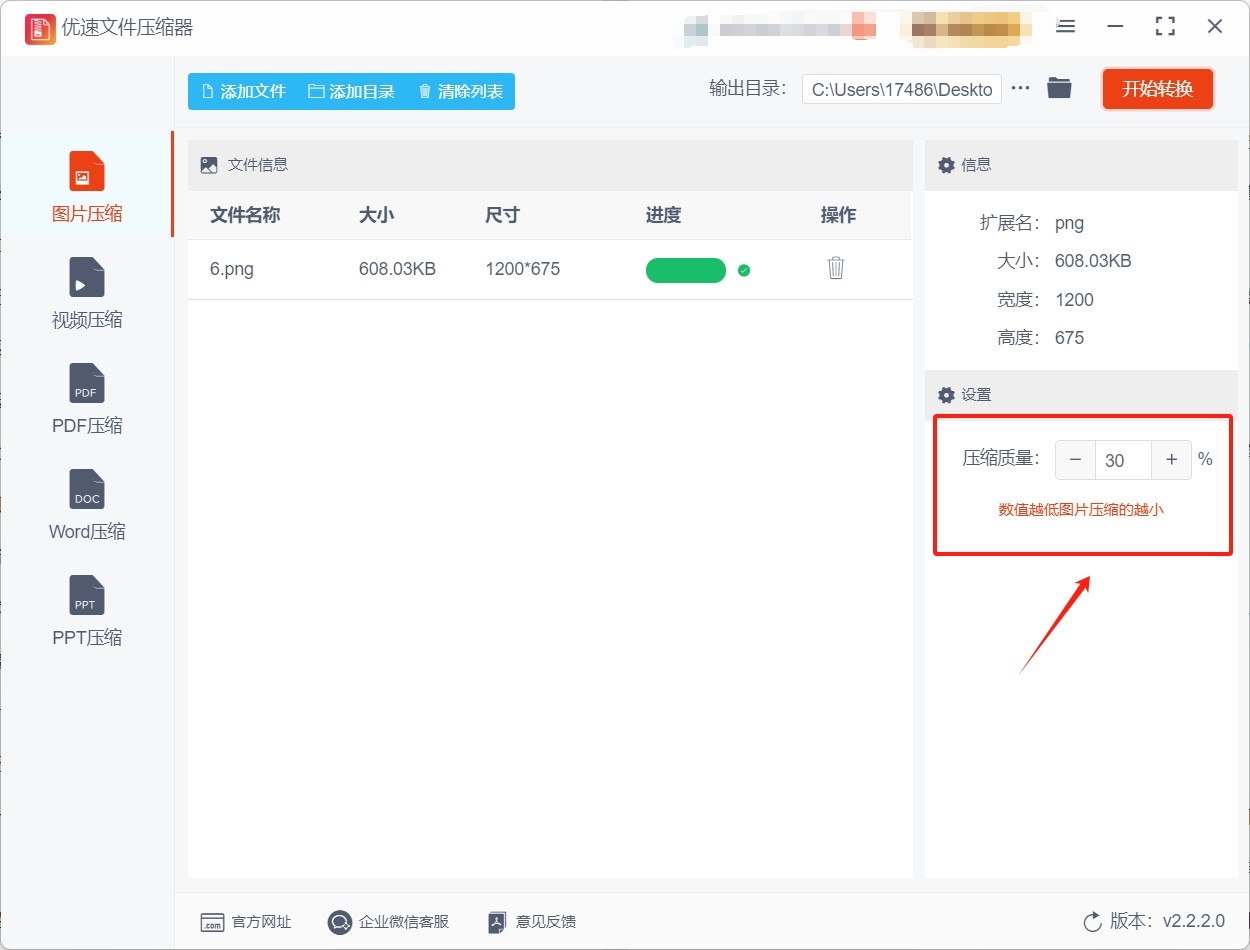 步骤4:确认【压缩质量】数值调节完毕后,请点击软件右上角的【开始转换】按钮,点击这个按钮就可以启动图片压缩程序了。