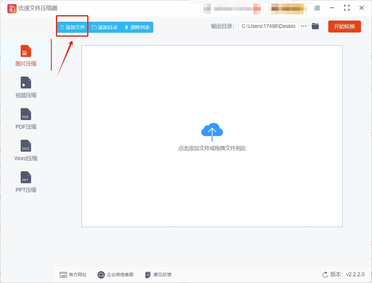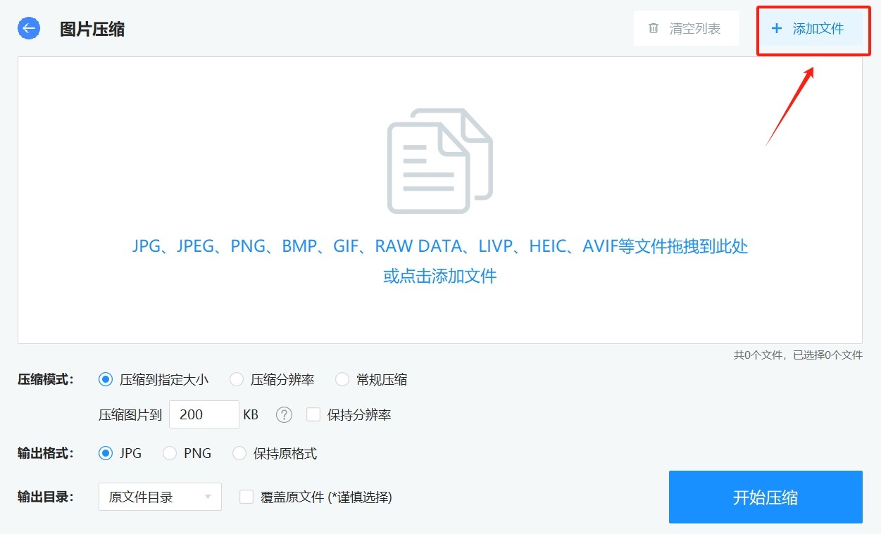 步骤2:点击功能来到新的界面后,大家只需点击界面右上角的添加文件按钮就可以选择想压缩的图片文件并将其导入到软件中。
