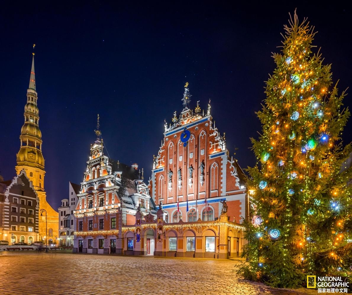 在拉脱维亚里加的圣彼得教堂外,耸立着一棵圣诞树。