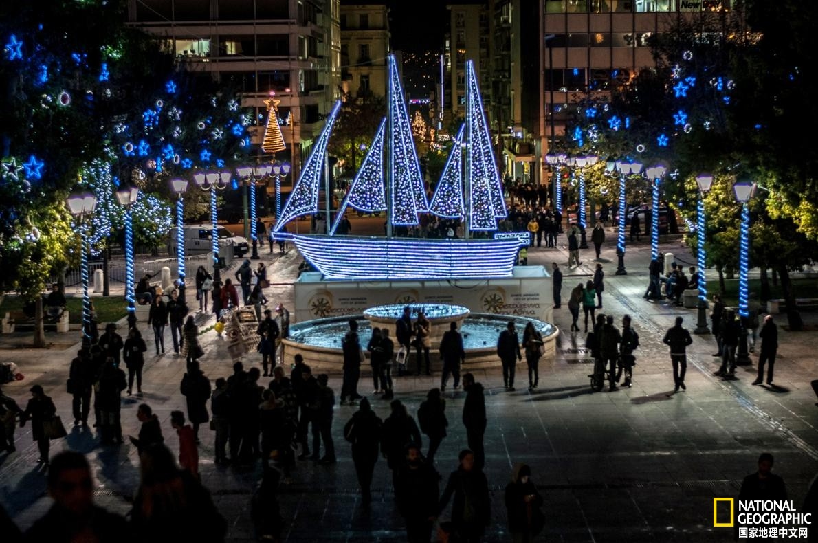 圣诞期间,一艘装饰着彩灯的船成为希腊雅典宪法广场的一大亮点。