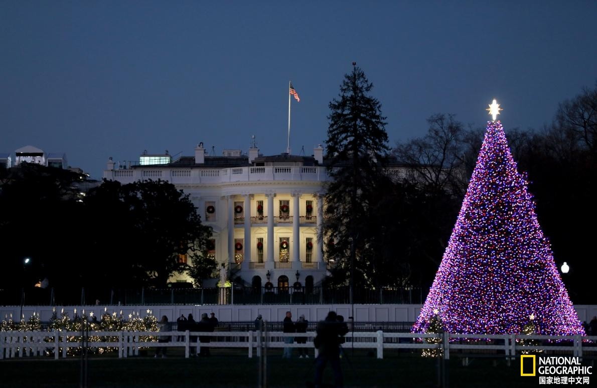 在华盛顿特区白宫以南的椭圆形草坪,国家圣诞树已被点亮。