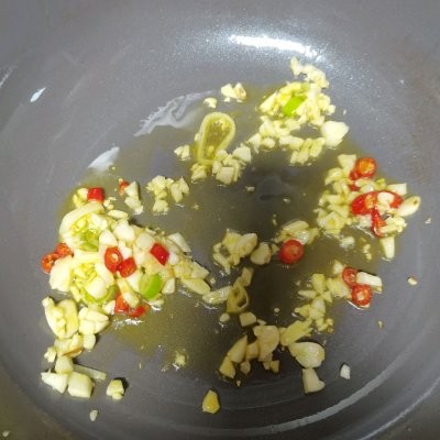 5、锅内加油,蒜末炒香。