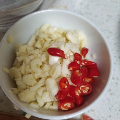 2、大蒜。小辣椒。切好备用。