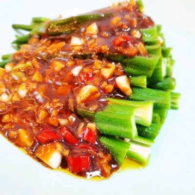黄秋葵 20个蒜瓣 4个干辣椒 1个蚝油 1勺海鲜酱油 3勺香醋 1勺砂糖 0.5勺食盐 少许食用油 适量水淀粉 5勺,适量