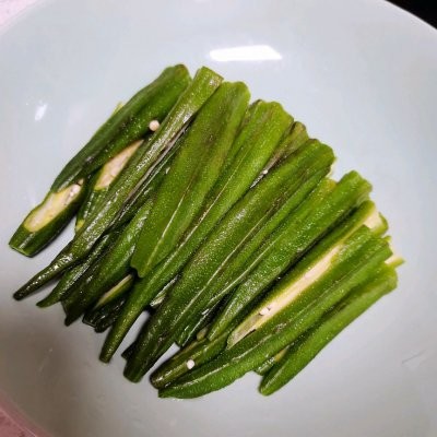 4、秋葵微凉后,一切两瓣,摆盘备用。