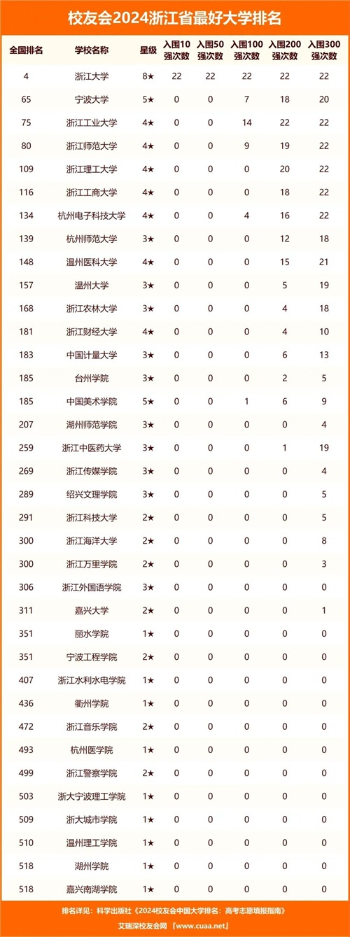 浙江省作为拥有众多高级学府的教育大省,浙江省的人们对于高校的关注也非常多,关于浙江省高校的排名也层出不穷,本次来看看校友会关于2024浙江省最好的大学的排名。