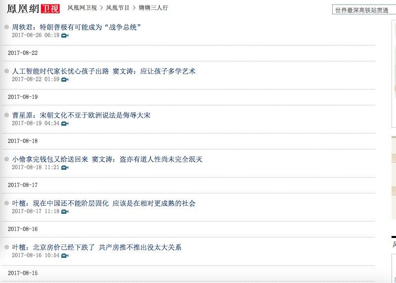 记者从凤凰网中锵锵三人行主页看到,最新一期的节目停留在2017年8月26日,《周轶君:特朗普极有可能成为“战争总统”》。不过,记者再次点击锵锵三人行,则显示页面已经删除。